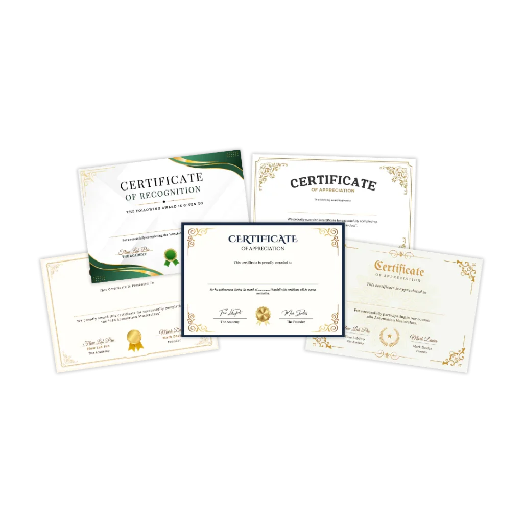 Complete the N8N Automation Masterclass and receive a professionally designed Certificate of Completion with your name, course title, and date. Perfect to showcase on LinkedIn, present to clients, or add to your portfolio as proof of your automation expertise.