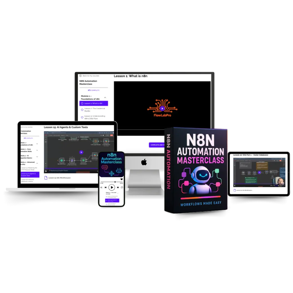 ✅ 24 HD Video Lessons ✅ JSON Workflow Files for Every Lesson ✅ Real Business Automation Projects ✅ AI Chatbot Project from Scratch ✅ Extended Commercial License ✅ Certificate of Completion 🎁 Bonus #1: Unlimited Lifetime Updates 🎁 Bonus #2: 500+ n8n Workflows ⚡ Instant Access 👍 No technical skills needed
